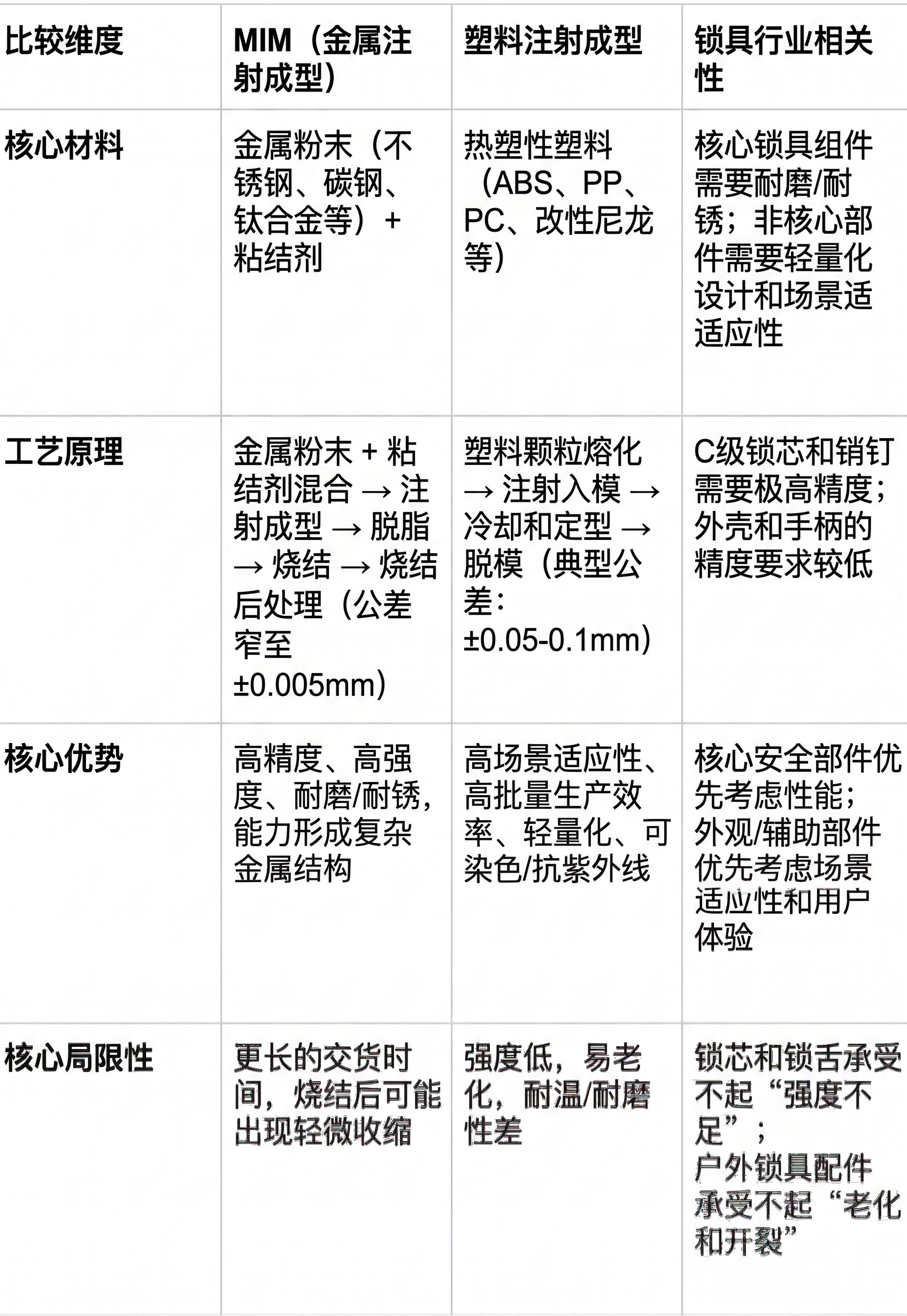 锁的核心要求是“安全可靠、耐磨损/防锈、精度稳定、适应不同场景”。不同部件的功能定位决定了选择金属注射成型(MIM)还是注射成型的优先顺序。